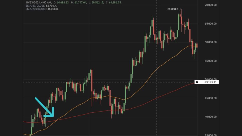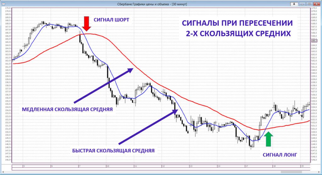 Когда быстрая EMA (например, с периодом 9) пересекает медленную EMA или SMA (например, с периодом 26) снизу вверх, это считается сигналом на покупку/рост (CALL). Пересечение сверху вниз трактуется как сигнал на продажу (PUT) и разворот вниз.