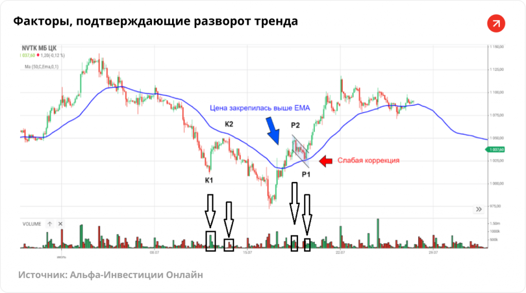 - В растущем тренде EMA поддерживает цену, давая опору для новых покупок, пока не произойдет пробой.